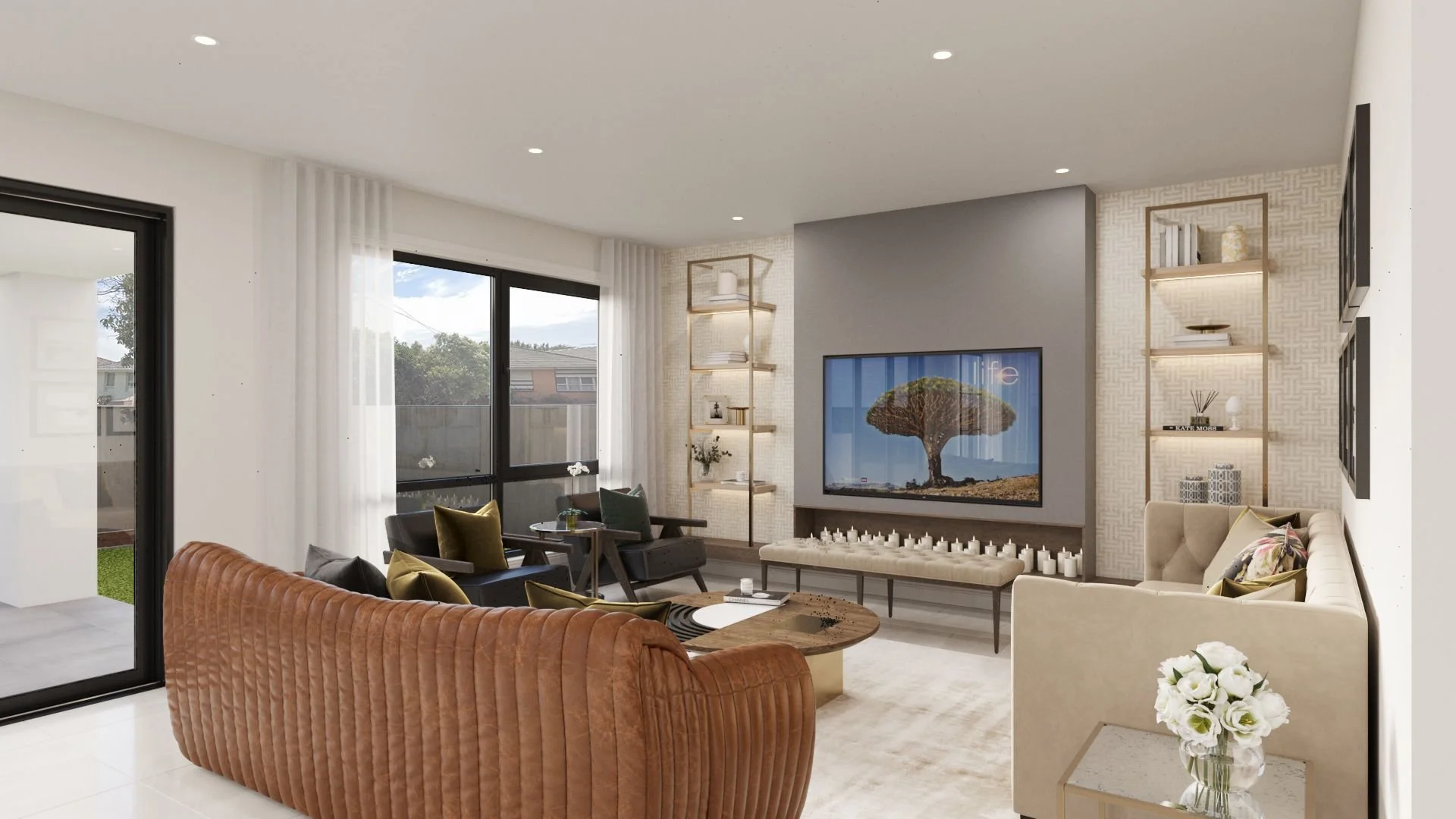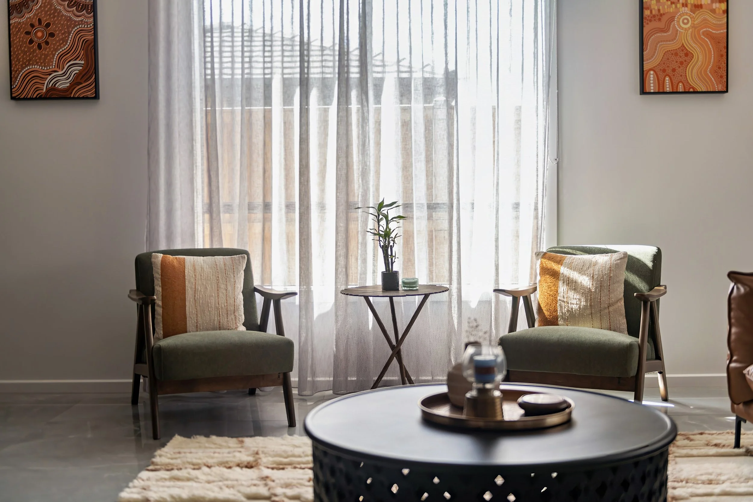 The dining area features statement lighting and artwork, a unique Serigraphy piece, coupled with a sleek and modern buffet. Come to the living room, and you’d notice the colour palette is inspired by nature, featuring a unique coffee table and timber wall paneling. The relaxing accent chairs inspire you to sit back and indulge in engaging conversations.